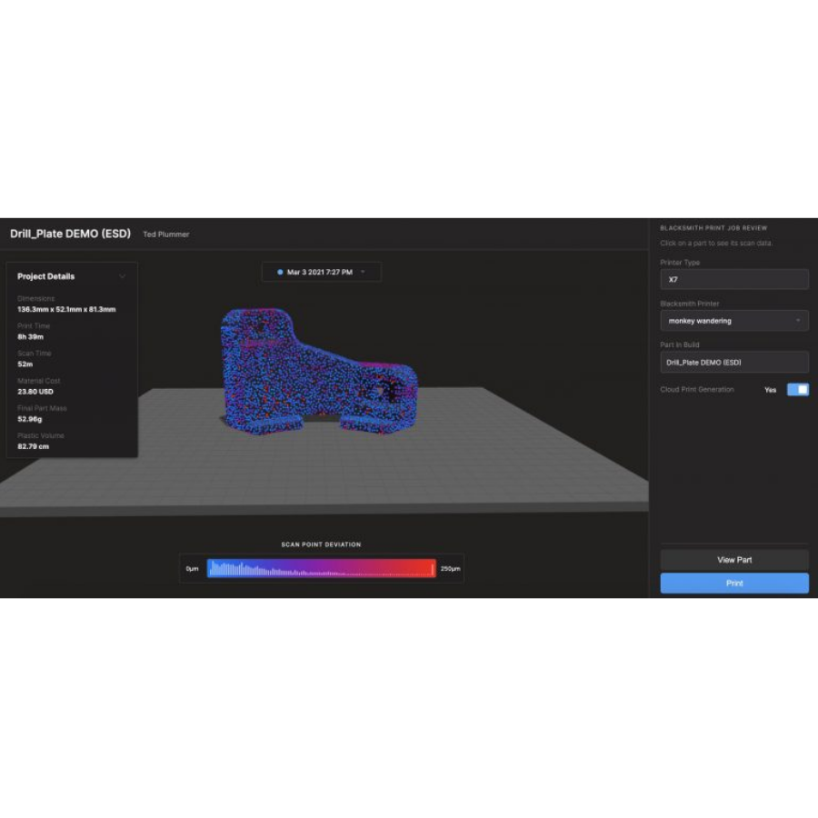 Inspection is an intuitive software and simple workflow with autonomous scanning to make part inspection accessible to all users. With the rich data visualization, users can view details and insights about parts using heat maps and point cloud visualizations, and capture snapshots of part accuracy with specific measurements for a more detailed look. In addition, the software will generate a customizable inspection report for documentation and traceability. In addition, the print failure detection feature will automatically pause a print for user review, saving time and material from prints that won’t be up to necessary standards.