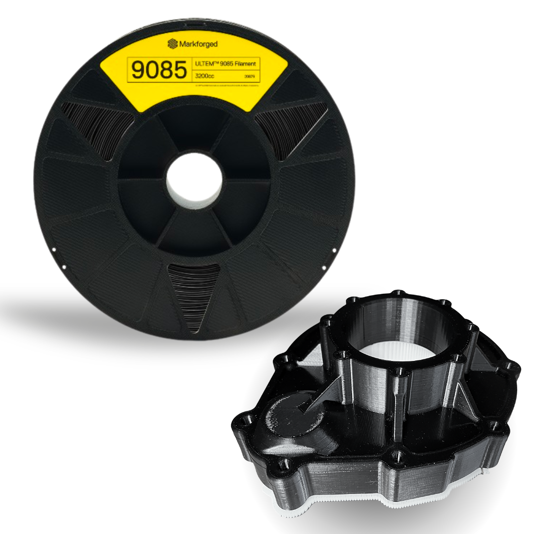 ULTEM™ 9085 Filament is a production-ready solution for aerospace 3D printing materials, especially when it’s printed on the Markforged FX20™. The printer’s controlled thermal environment and high-temperature extrusion architecture support consistent layer adhesion and precise geometry on large, complex builds. This integration allows engineering teams to replace outsourced PEI components with in-house additive workflows, reducing lead time and improving part availability. As a result, ULTEM™ 9085 Filament accelerates prototyping and production while ensuring every printed part meets industrial performance requirements.